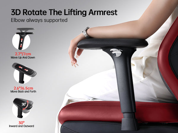 3D Precision Armrest Adjustment — Height, forward/backward movement, and 30° rotation adapt seamlessly to any gaming posture, delivering pro-level arm support for FPS, MOBA, and extended play sessions.
