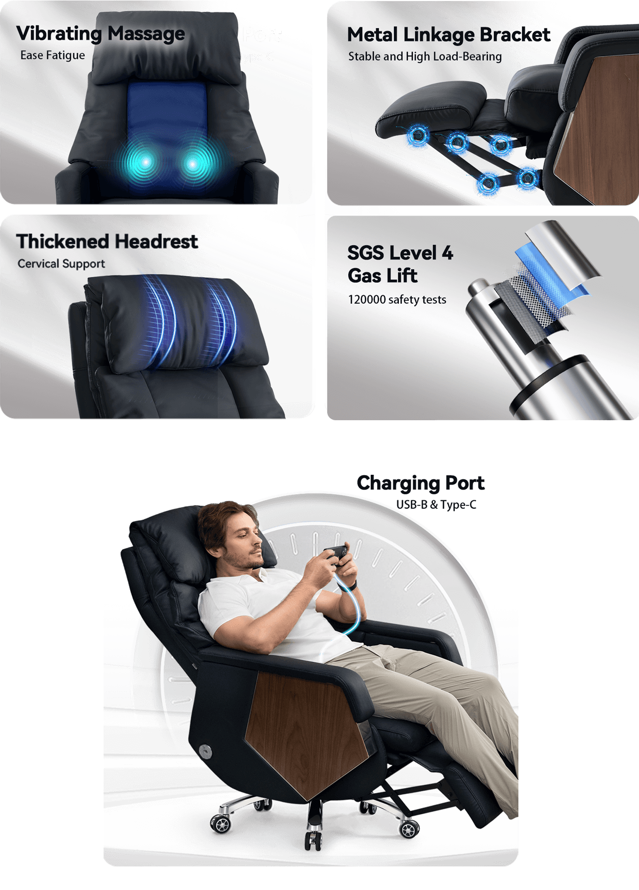 Das ergonomische Design passt sich Ihrer Taille und Ihrem Nacken an und sorgt so für ein bequemes Sitzerlebnis. Die durchdachten Armlehnen minimieren den Druck und ermöglichen Ihnen bequemes Sitzen über längere Zeiträume. Außerdem ist eine Vibrationsmassage für Ihren unteren Rücken nur einen Knopf entfernt.